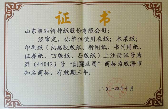 In October 2014, "Kaili" trademark won Weihai famous trademark