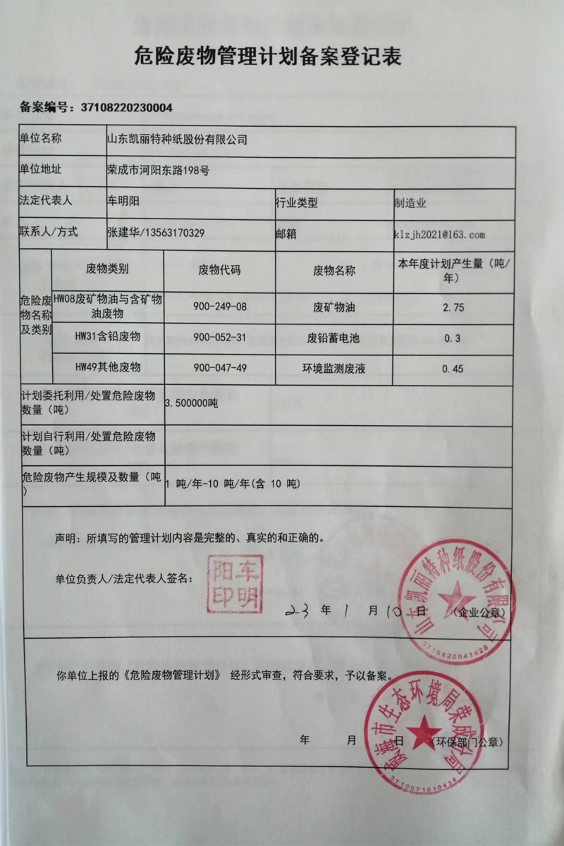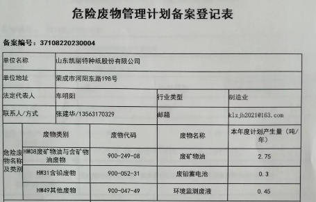 危險(xiǎn)廢物管理計(jì)劃備案登記表